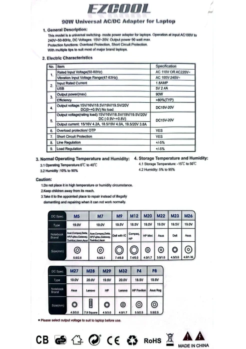 מפרט טכני – מטען EZCOOL AD-805 90W